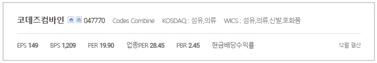 | 설립일 | 1995/08/16 (상장일: 2001/09/18) | 기업명 | 코데즈컴바인 |