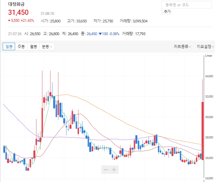 한국거래소에 따르면 대정화금은 이날 오전 11시 11분 기준 전 거래일 대비 5900원 (22.78%) 오른 3만2500원에 거래 중입니다. 현재 대정화금의 거래량은 최근 5거래일 거래량의 최고치를 경신하며 투자자들의 관심을 받고 있습니다.