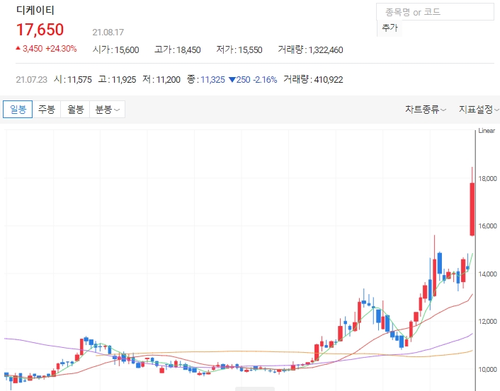 17일 오전 9시 2분 디케이티는 전 거래일 대비 2950원(20.77%) 오른 1만7150원에 거래되고 있다. 장중 1만8000원까지 오르면서 52주 신고가를 경신했습니다.