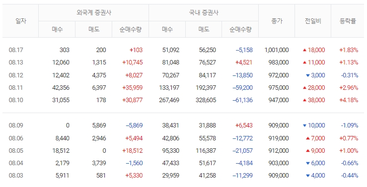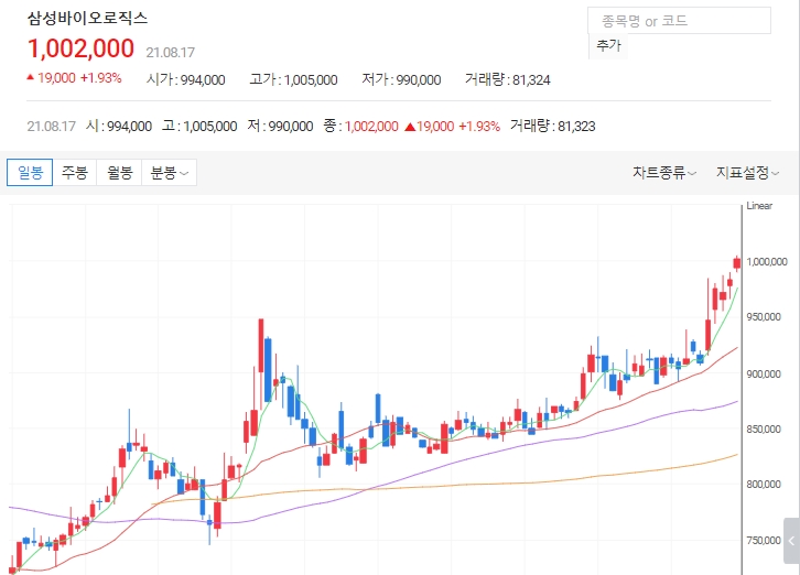 삼성바이오는 지난 13일에도 장중 99만원을 터치하는 등 강세를 보였고, 이틀 연속 오름세를 기록중입니다. 장중 한때 100만 5천원까지 오르며 52주 신고가를 경신했습니다.