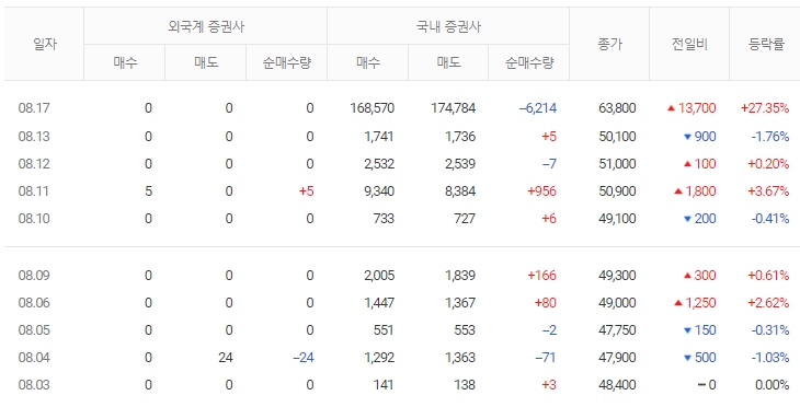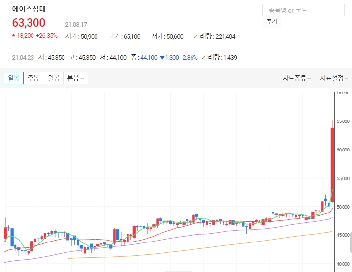17일 한국거래소에 따르면 오전 9시 40분 기준 에이스침대는 전 거래일 대비 20.96%(1만500원) 상승한 6만600원에 거래되고 있습니다. 추세선으로 보면 현재 단기·중기 이평선이 정배열 상태로 상승세를 보이고 있습니다. 최근 이 종목의 차트에서 최근 5일 매물대 돌파 등의 특이사항이 발생했습니다.