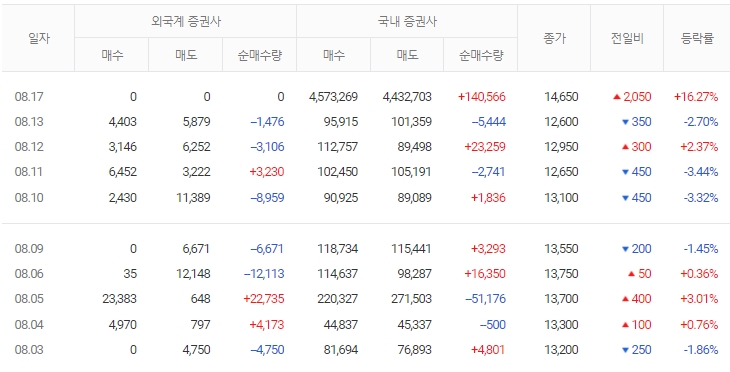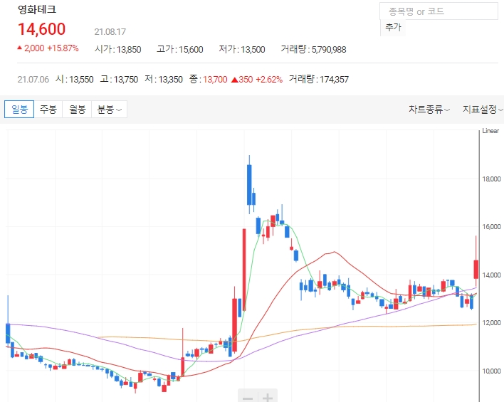 17일 오전 9시10분 영화테크는 전 거래일 대비 1500원(11.90%) 오른 1만4150원에 거래되고 있습니다. 영화테크는 12일을 제외하고 9일부터 13일까지 1~4%의 낙폭을 나타냈습니다.
