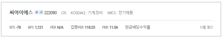 17일 오후 1시24분 씨아이에스는 전 거래일 대비 10.89% 오른 1만3750원에 거래되고 있습니다. 지난 13일 주식시장에서 씨아이에스 주가는 전일 대비 2.90% 오른 1만2400원 상승했습니다.