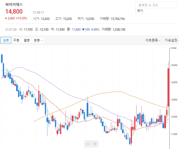 17일 오후 1시24분 씨아이에스는 전 거래일 대비 10.89% 오른 1만3750원에 거래되고 있습니다. 지난 13일 주식시장에서 씨아이에스 주가는 전일 대비 2.90% 오른 1만2400원 상승했습니다.