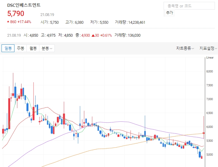 19일 한국거래소에 따르면 오전 9시 24분 기준 DSC인베스트먼트는 전일 대비 13.79%(680원) 상승한 5610원에 거래되고 있습니다. DSC인베스트먼트 시가총액은 1571억원이며, 시총순위는 코스닥 644위로 액면가는 1주당 500원입니다.