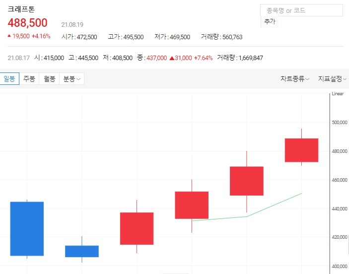 19일 오전 9시 46분 크래프톤 은 전 거래일 대비 5.01% 오른 49만2500원에 거래되고 있으며 이날 크래프톤 의 장중 최고가는 49만5500원으로 공모가(49만8000원)보다는 아래지만 상장 이후 가장 높은 수준입니다. 크래프톤은 4거래일 연속 오름세를 보이고 이어가고 있습니다.