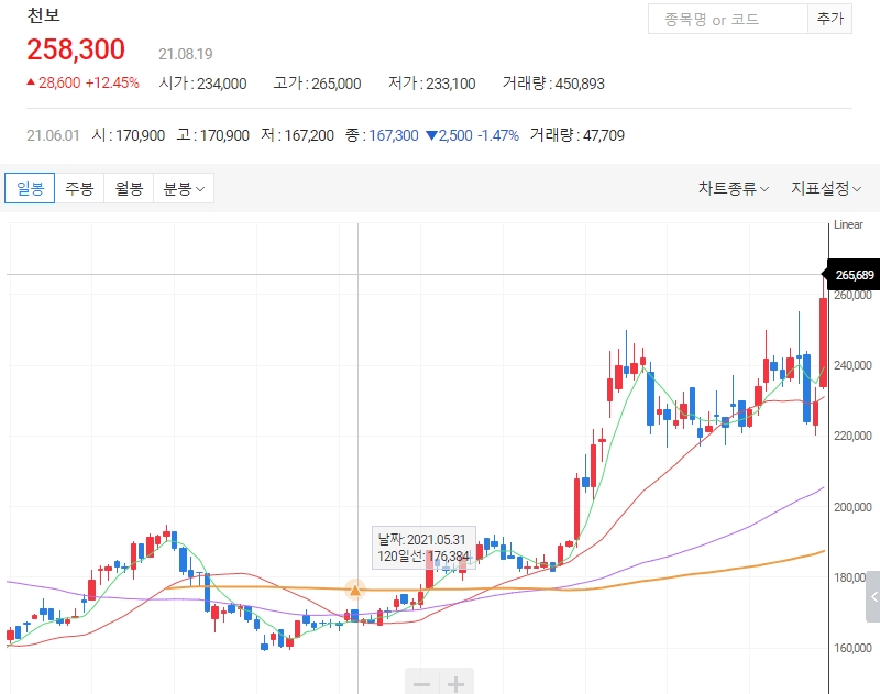 천보는 장중 최고 26만5000원까지 오르면서 52주 신고가를 경신했습니다. 현재 시가총액은 2조5860억원으로 코스닥 시총 15위에 해당합니다.