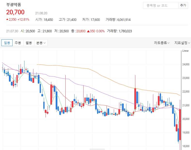부광약품 주가는 20일 오전 11시 50분 기준 전일대비 15.8%(2,900원) 상승한 21,250원에 거래되고 있으며 개인의 매수세가 이어지고 있습니다.