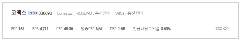 | 설립일 | 1976/12/03 (상장일: 2000/01/18) | 기업명 | 코맥스 |