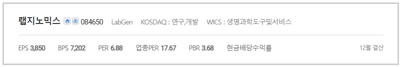 | 설립일 | 2002/03/29 (상장일: 2014/12/16) | 기업명 | 랩지노믹스 |