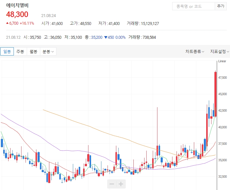 에이치엘비 주가는 지난 18일 코로나19백신 권리인수를 발표하며 15.38% 급등한 4만2000원을 기록한 이후 우상향세를 이어가고 있습니다.