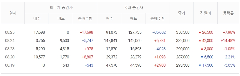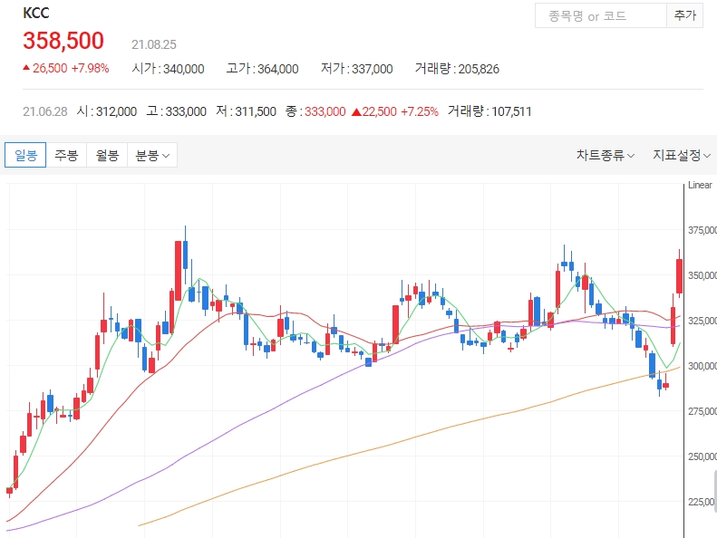 전일인 24일 KCC는 14.48% 상승한 33만2000원에 거래를 마쳤습니다. 25일에는 외국인의 매수세가 이어지며 주가 상승을 견인하고 있습니다.