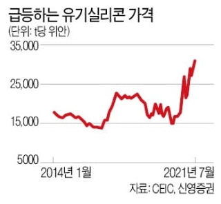 KCC 주가가 급등한 것은 글로벌 유기실리콘 가격이 연일 사상 최고치를 기록하고 있기 때문입니다. 유기실리콘은 규소로 만든 접착제로 윤활유 역할도 합니다. 건설용, 산업용으로 많이 쓰이는 유기실리콘 가격은 지난해까지 t당 1만5000~2만위안 안팎에서 거래됐지만 최근 들어 약 3만위안까지 상승했습니다.