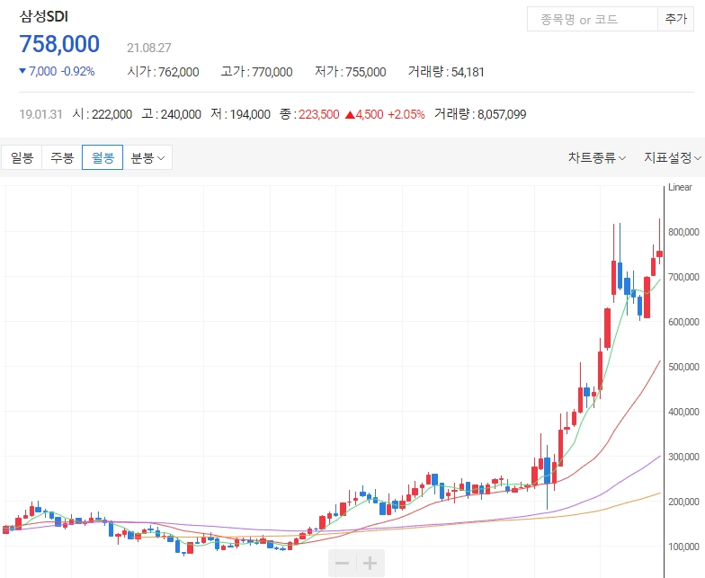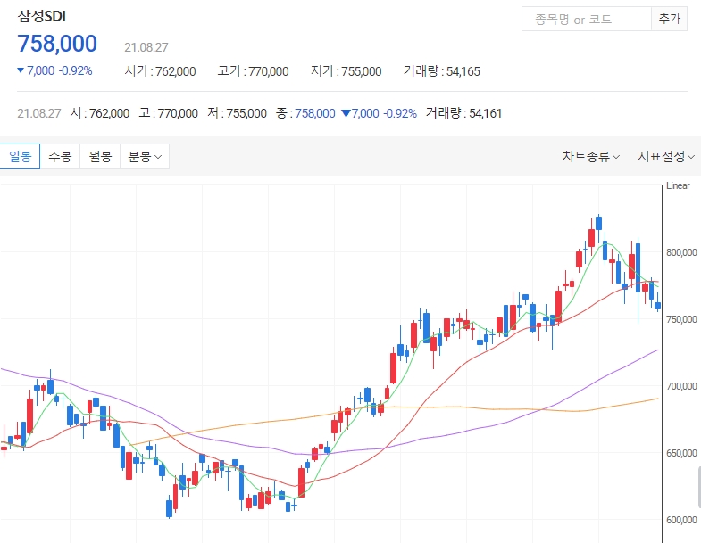삼성SDI 주가 는 8월 26일 14시 46분을 기준으로 전날 기준 1.80% 하락한 762,000원 이며 장 초반 잠깐 상승 이후 전체적으로 하락 된 분위기를 보이고 있습니다.
