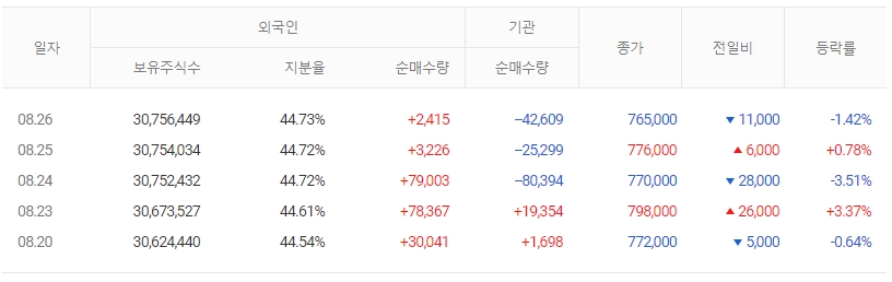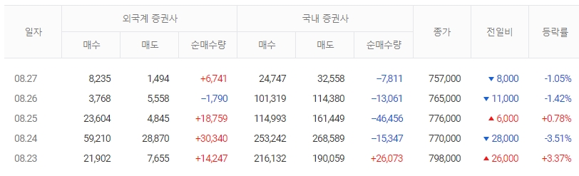 | 52Weeks 최고/최저 | 828,000 / 406,000 | 액면가 | 500 |