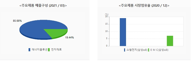삼성SDI의 주요 사업은 에너지솔루션 부문과 전자 재료부문으로 구분됩니다. 매출 구성으로 볼때 2021년 하반기 기준으로 에너지 솔루션 부문이 80.56%를 차지하고 있습니다. 주로 중/대형 리튬 이온 2차전지를 생산/판매하고 있습니다. 전자재료 부문은 반도체 및 디스플레이 소재를 생산/판매하고 있습니다.