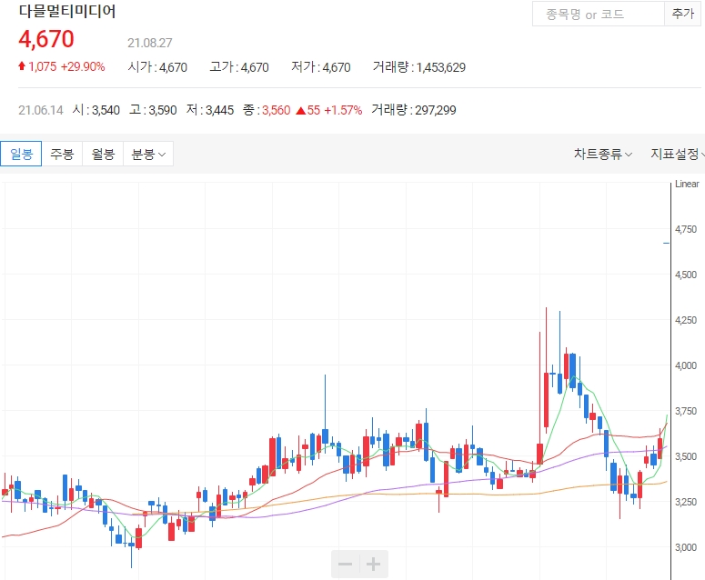 27일 한국거래소에 따르면 오전 9시 22분 기준 다믈멀티미디어 주가는 전일보다 29.90% 오른 4670원입니다. 52주 신고가를 경신하며 상한가를 기록했습니다. 또한 골든크로스가 발생했습니다.