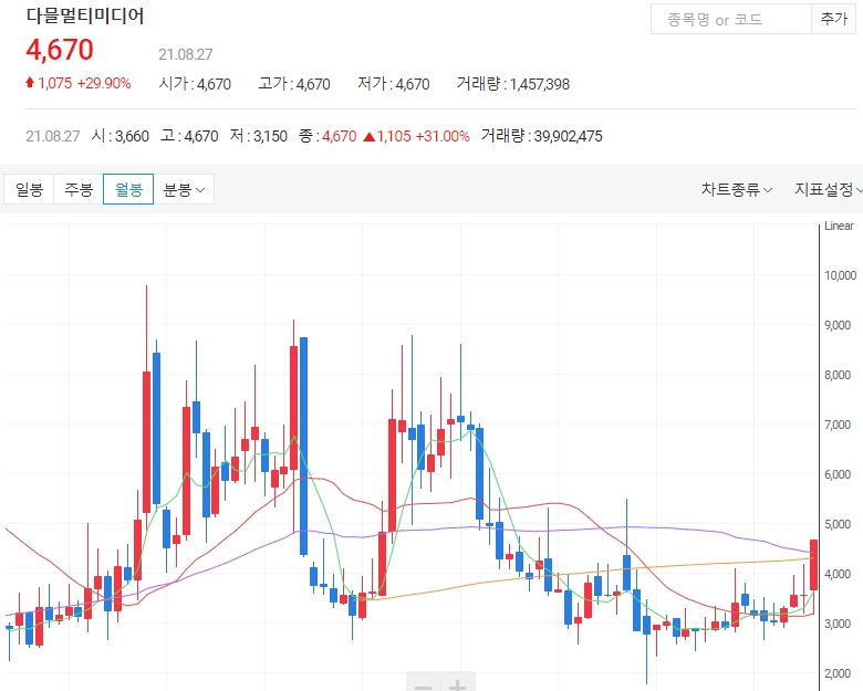 다믈멀티미디어가 최대주주가 베노홀딩스로 변경됐다는 소식에 27일 장시작과 함께 상한가로 직행했습니다. 한국거래소에 따르면 이날 오전 9시46분 현재 다믈멀티미디어주가는 전 거래일 대비 29.90%(1075원)오른 4670원에 거래중입니다. 오늘은 다믈멀티미디어 주가 전망에 대해 알아보겠습니다.