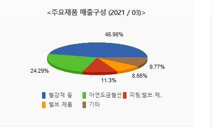 한국선재의 주요 사업은 철강재와 밸브사업입니다. 매출 구성으로 볼때 2021년 하반기 기준으로 철강재, 45.98, 아연도금철선 24.29, 피팅,밸브 제품 11.30, 밸브 제품 8.66, 기타로이루어지고 있습니다.