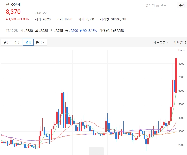 선재 제조 및 판매업체인 한국선재는 27일 오전 9시 35분 현재 전날보다 13.39% 오른 7790원에 거래되고 있습니다. 한국선재는 홍준표 의원 관련주로 분류되는 정치테마주이기도 합니다. 오늘은 한국선재 주가전망에 대해 알아보겠습니다.