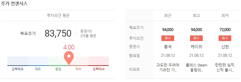 증권사가 분석한 위메이드 주가는 평균 83,750원으로 최고 94,000원, 최저 72,000원으로 전망하고 있습니다.