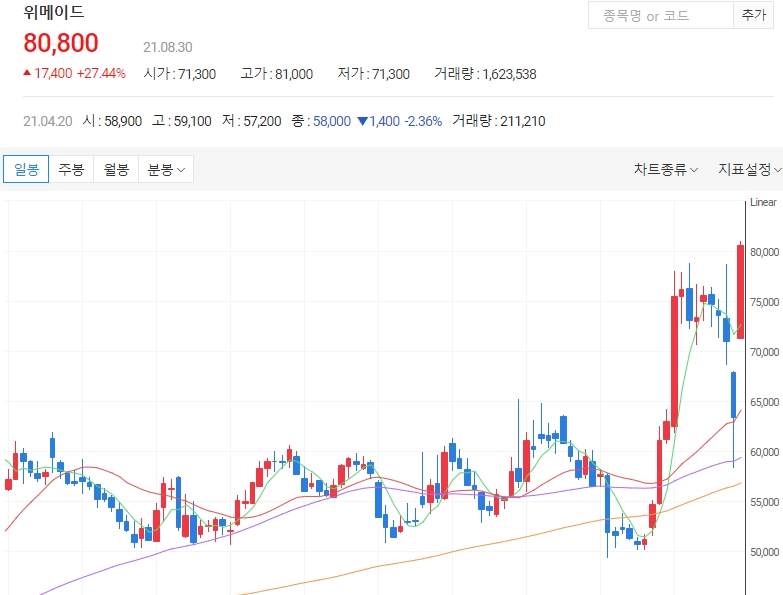위메이드 주가가 신작 ‘미르4’ 글로벌 출시 소식이 알려진 이후 오전장 들어 강세를 보이고 있습니다. 30일 오전 11시 35분 위메이드의 주가는 전일대비 1만4700원(23.19%) 상승한 7만8100원에 거래되고 있습니다. 오늘은 위메이드 주가 전망에 대해 알아보겠습니다.