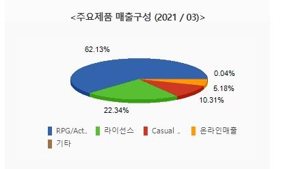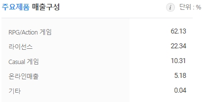 동사의 주요제품 매출 구성비율은 RPG/Action 62.13%, 라이선스 22.34%, Casual게임 10.31%, 온라인매출 5.18%로 구성되어 있습니다. 전체매출의 62%의 매출을 RPG/Action이 차지하고 있습니다.