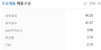 동사의 주요제품 매출 구성비율은 용역매출인 네트워크 구축 및 유지보수로 구성되어 있습니다. 전체매출의 절반가량을 네트워크가 차지하고 있습니다.