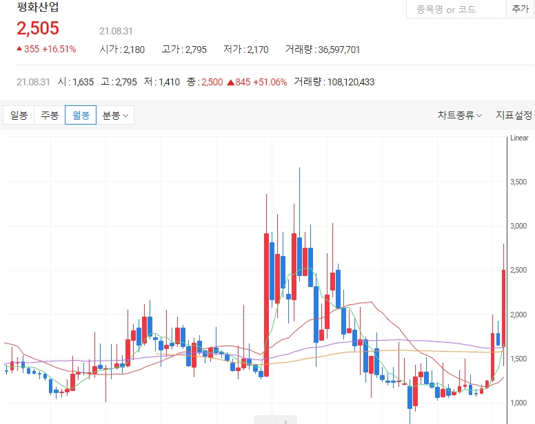 평화산업은 지난해 8월 52주 최저가 1,025원을 기록했습니다. 1200원대에서 등락을 거듭하다가 6월 11일 상한가를 기록한 이후 상승세를 이어왔다. 이날 장중 52주 최고가(2,795원)를 갱신했습니다. 평소 20-30만주 안팎에서 거래되던 거래량이 상승장에서 2000만주까지 거래량이 증가했는데 이런 이유에서 특정세력의 개입 의혹이 제기되고 있습니다.