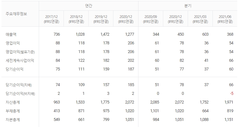 원익피앤이의 2020년 매출액은 전년대비 -13.2% 줄어든 1277억원이고, 영업이익은 전년대비 16.1% 늘어난 206억원을 기록했습니다. 이 회사의 매출액 증감률과 영업이익 증감률은 각각 코스닥 하위 27%, 상위 42%에 해당됩니다.