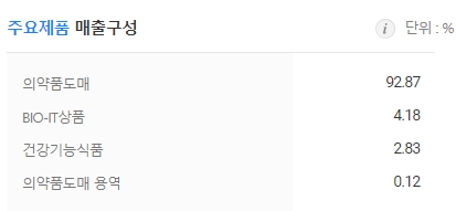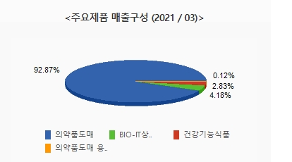 동사의 주요제품 매출 구성비율은 의약품도매가 92.87%, BIO-IT상품 4.18%, 건강기능식품 2.83%로 구성되어 있습니다. 전체매출의 93% 가량을 의약품도매 차지하고 있습니다.