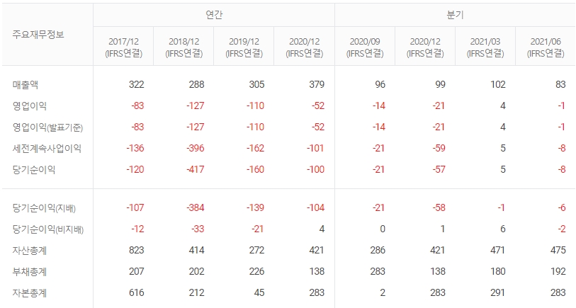 매출액은 전년대비 5.34% 감소한 83.12억원, 순손실은 전년대비 적자지속한 8.37억원을 기록했으며 누적 기준으로 매출액, 영업이익, 순손실이 각각 184.68억원, 3.28억원, 3.75억원으로 전년동기 대비 -0.11%, 흑자전환, 적자지속을 기록했습니다.