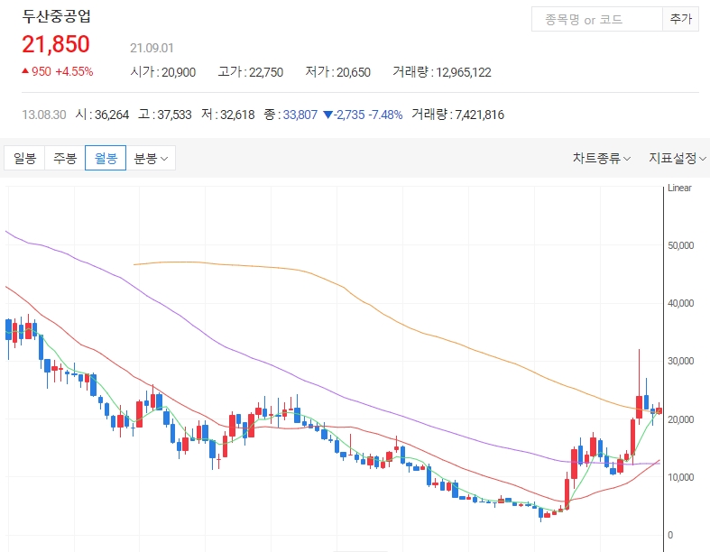 두산중공업은 9월 1일 오후 12시 40분 기준 850원이 올라 4.07% 상승중입니다. 외국인의 매수세가 이어지고 있으며 개인추자자들도 매수를 이어가며 주가 상승을 견인하고 있습니다