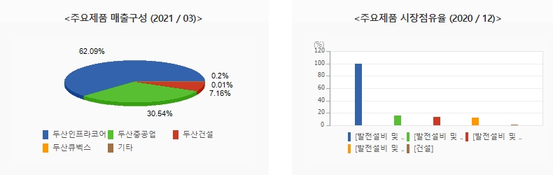 동사의 주요제품 매출 구성비율은 두산인프라코어 62.09%, 두산중공업 30.54%, 두산건설 7.16%로 구성되어 있습니다. 전체매출의 60%이상을 두산인프라코어가 차지하고 있습니다.