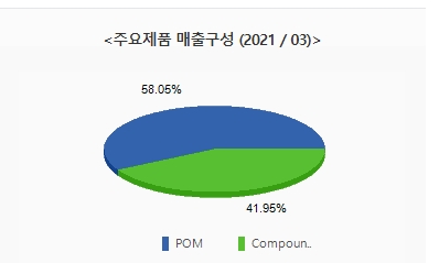 동사의 주요제품 매출 구성비율은 POM 58.5%, Compound 41.95%로 구성되어 있습니다. 전체매출의 절반가량을 POM이 차지하고 있습니다.
