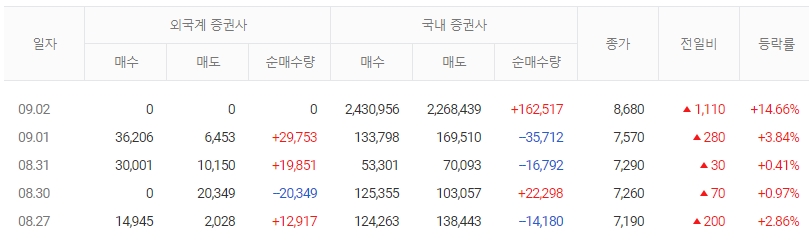 2일 오전 9시 2분 현재 전날보다 15.98% 오른 8780원에 거래되고 있습니다. 이날 거래량은 전일 대비 278.9% 급증하면서 최근 5거래일 거래량의 최고치를 넘어섰습니다. 외국인과 기관 그리고 개인의 매수세가 계속되며 주가 상승을 이끌고 있습니다.