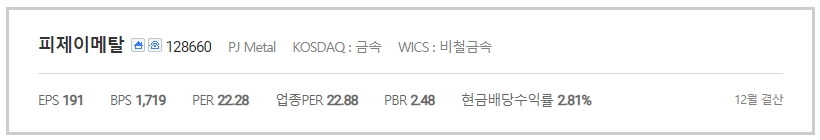 피제이메탈은 2020년 매출액 1281억원과 영업이익 64억원을 기록했습니다. 전년대비 매출은 -9.8% 하락했고, 영업이익은 46.7% 상승했습니다. 이 회사의 매출액 증감률과 영업이익 증감률은 각각 코스닥 하위 32%, 상위 31%에 해당됩니다.