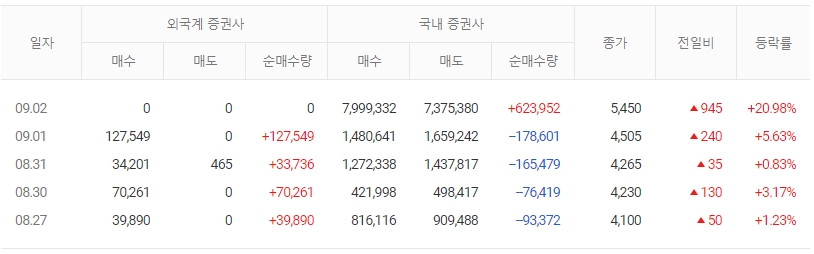 현재 피제이메탈의 거래량은 최근 5거래일 거래량의 최고치를 경신하며 투자자들의 관심을 받고 있습니다. 거래원 동향은 미래에셋, NH투자, 삼성증권 등이 매수 상위 목록에 나타나고 있습니다. 아직까지 외국계 증권사 창구를 통한 매매는 발생하지 않고 있습니다.