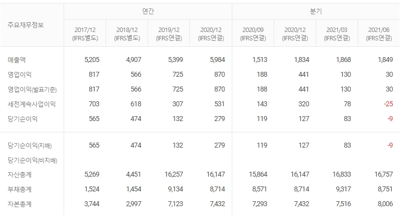 매출 및 영업이익은 16년~17년 상승, 18년 하락 이후 20년까지 상승했으며, 당기순이익은 상승과 하락을 반복하고 있습니다.
