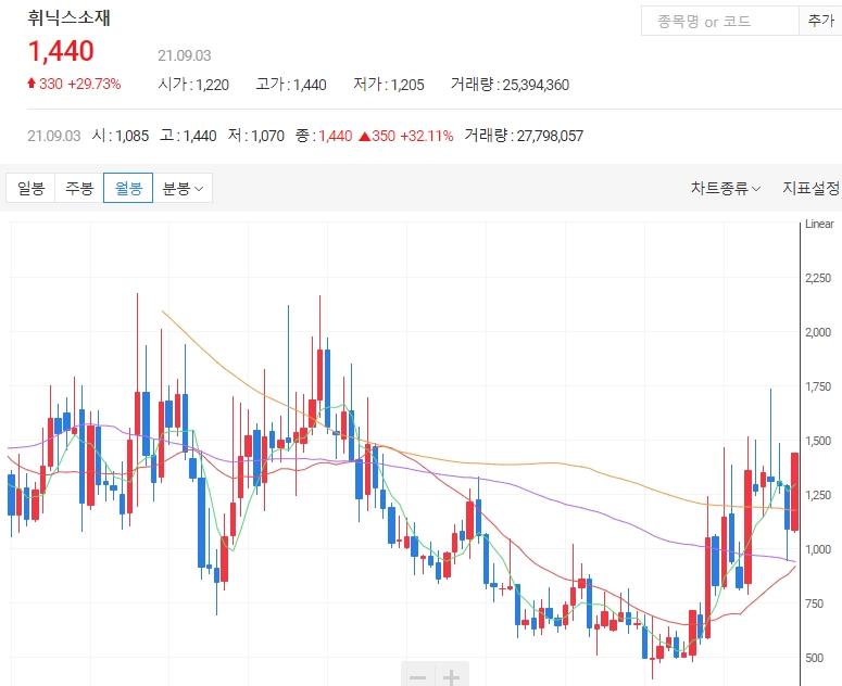 휘닉스소재는 최재형관련주이기도 하지만 이차전기 관련주로도 꼽히고 있습니다.