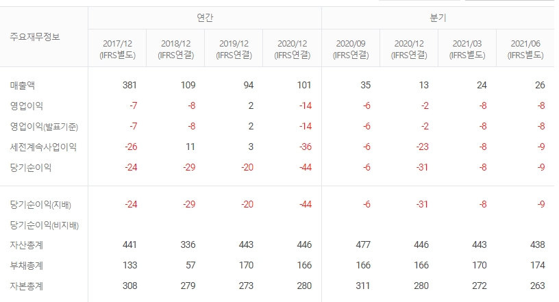 휘닉스소재는 21년 2분기 매출액은 26억, 영업이익 -8억원, 순이익은 -9억원을 기록했습니다. 계속되는 순이익이 마이너스로 실적으로 봤을때 지속적인 적자를 면치 못하고 있습니다.