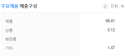 동사의 주요제품 매출 구성비율은 제품 98.41%, 기타 1.47%로 구성되어 있습니다. 전체매출의 대부분을 제품이 차지하고 있습니다.