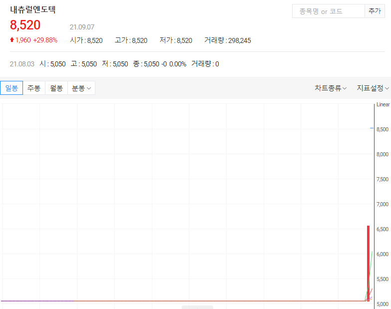 내츄럴엔도텍은 지난 3일 한국거래소가 상장 유지 결정을 내림으로써 거래가 재개된 후 거래재개 첫 날 ‘상한가’에 이어 이날도 이틀째 상한가를 기록하고 있습니다. 내츄럴엔도텍은 전날 1510원 오른 6560원에 장을 마친데 이어 이날에도 상한가를 기록하며 8520원까지 올랐습니다.
