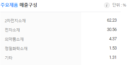 동사의 주요제품 매출 구성비율은 2차전지소재 62.23%, 전자소재 30.56% 의약품소재 4.37%, 정밀화학소재 1.53%, 기타 1.31%로 구성되어 있습니다. 전체매출의 90%가량을 2차전지소재와 전자소재가 차지하고 있습니다.