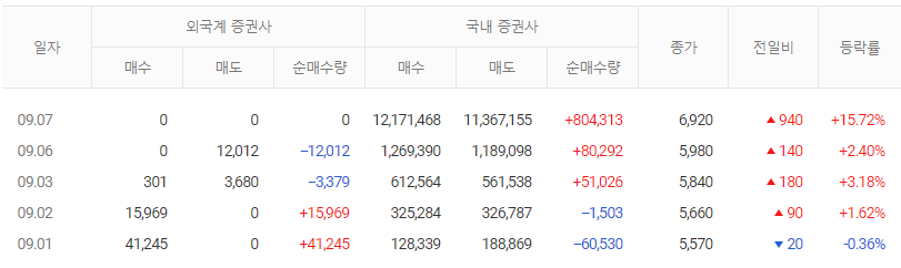 이날 거래량은 전일 대비 220.0% 급증하면서 최근 5거래일 거래량의 최고치를 넘어섰습니다. 거래원 동향은 미래에셋, NH투자 등이 매수 상위 목록에 나타나고 있습니다. 아직까지 외국계 증권사 창구를 통한 매매는 발생하지 않고 있으며