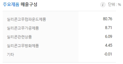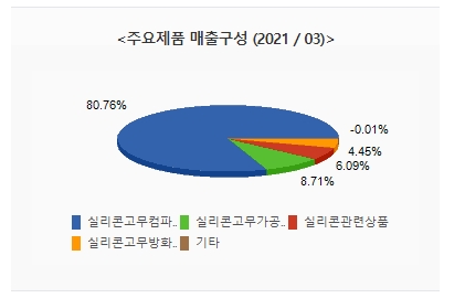 동사의 주요제품 매출 구성비율은 실리콘고무컴파운드제품 80.76%, 실리콘고무가공제품 8.71%, 실리콘관련상품 6.9% 로 구성되어 있습니다. 전체매출의 80%가량을 실리콘고무컴파운드제품이 차지하고 있습니다.
