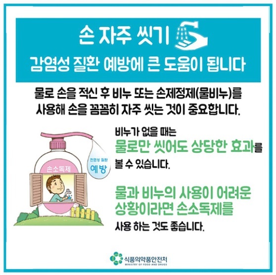 - 손 씻기를 할 때는 비누를 손에 묻히고 15초 이상의 마찰로 손 씻기를 하며 지나치게 오래 손을 씻는 것도 피하는 것이 좋습니다.