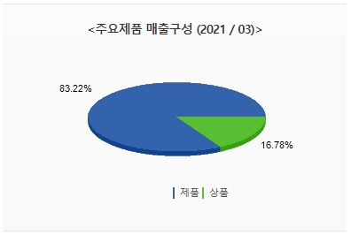 동사의 주요제품 매출 구성비율은 제품83.22%, 상품 16.78%로 구성되어 있습니다. 전체매출의 80%가량을 제품이 차지하고 있습니다.