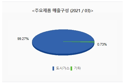 동사의 주요제품 매출 구성비율은 도시가스 99.27%로 구성되어 있습니다. 전체매출의 대부분을 도시가스가 차지하고 있습니다.