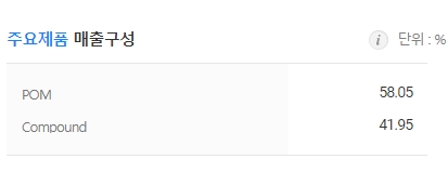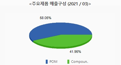 동사의 주요제품 매출 구성비율은 POM 58.05%, Compound 41.95%로 구성되어 있습니다. 전체매출의 58%가량을 POM이 차지하고 있습니다.